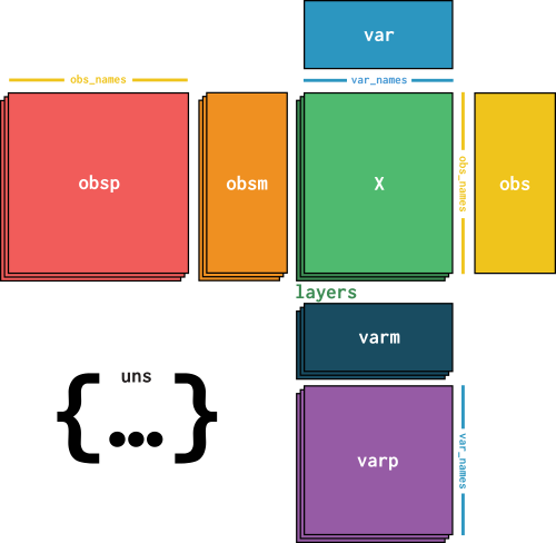 Annotations for cell-cell and gene-gene pairs are in obsp (all matrices in obsp must have shape n_cells x n_cells and use obs_names as an index to both dimensions) and varp (all matrices in varp must have shape n_genes x n_genes and use var_names as an index to both dimensions), a Python dictionary.