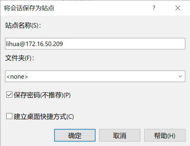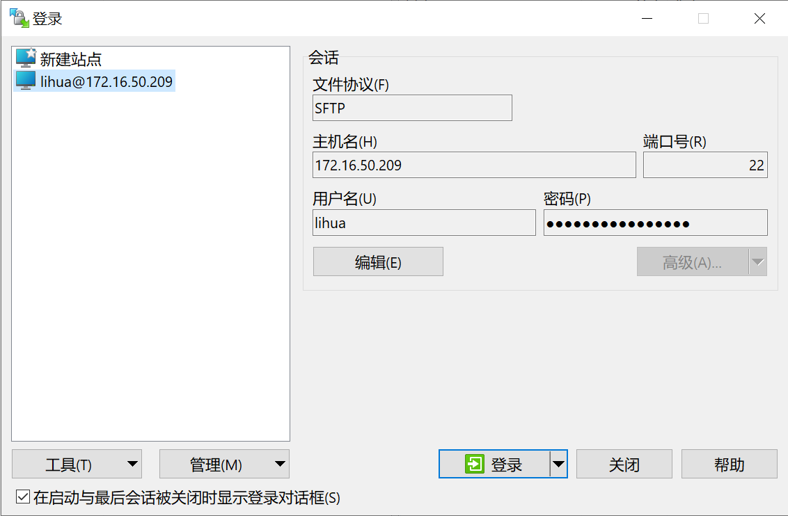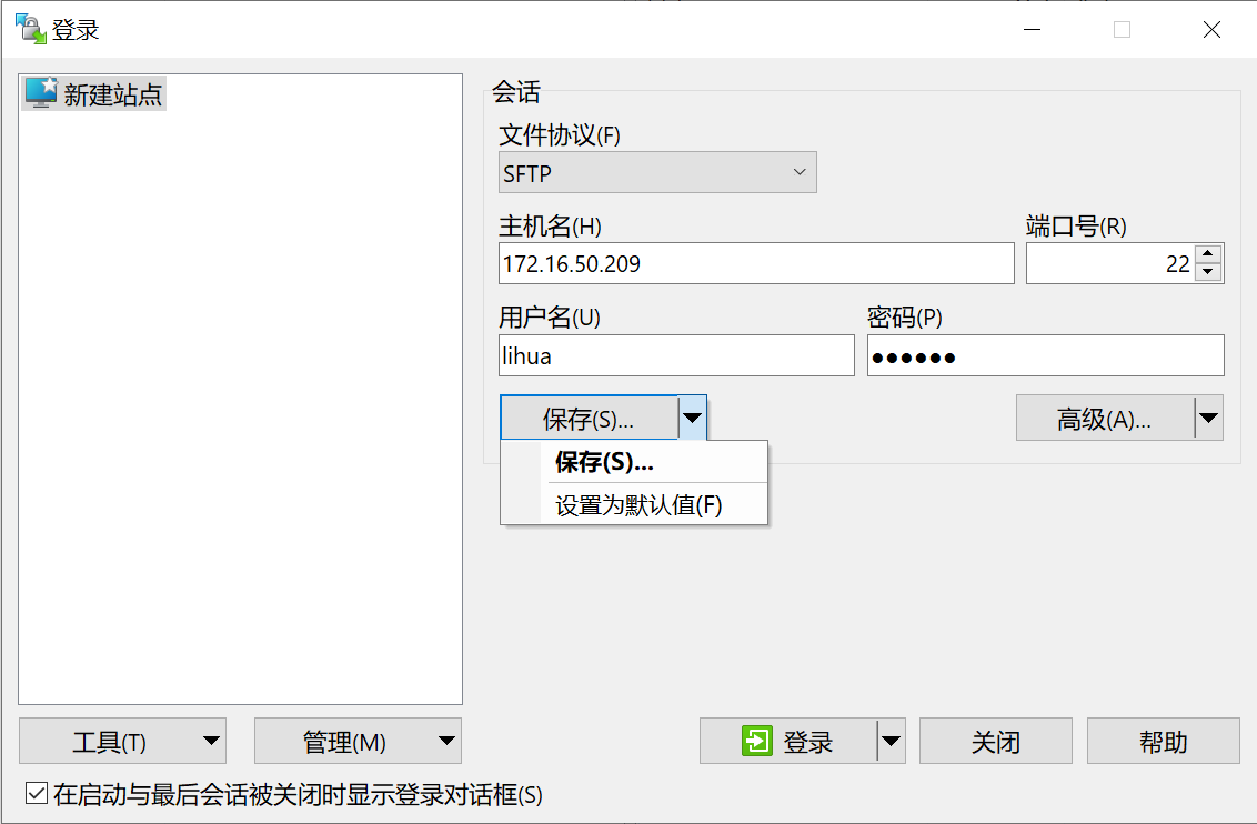 172.16.50.209), port (22), user name, as well as password, and then click “Save”: