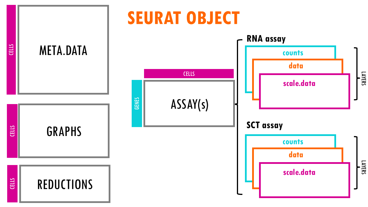 The Seurat object contains the following important data structures: